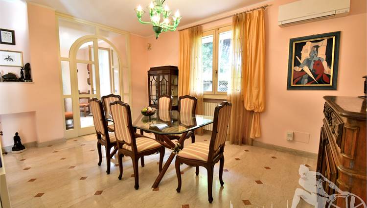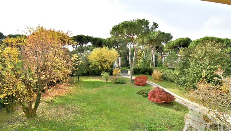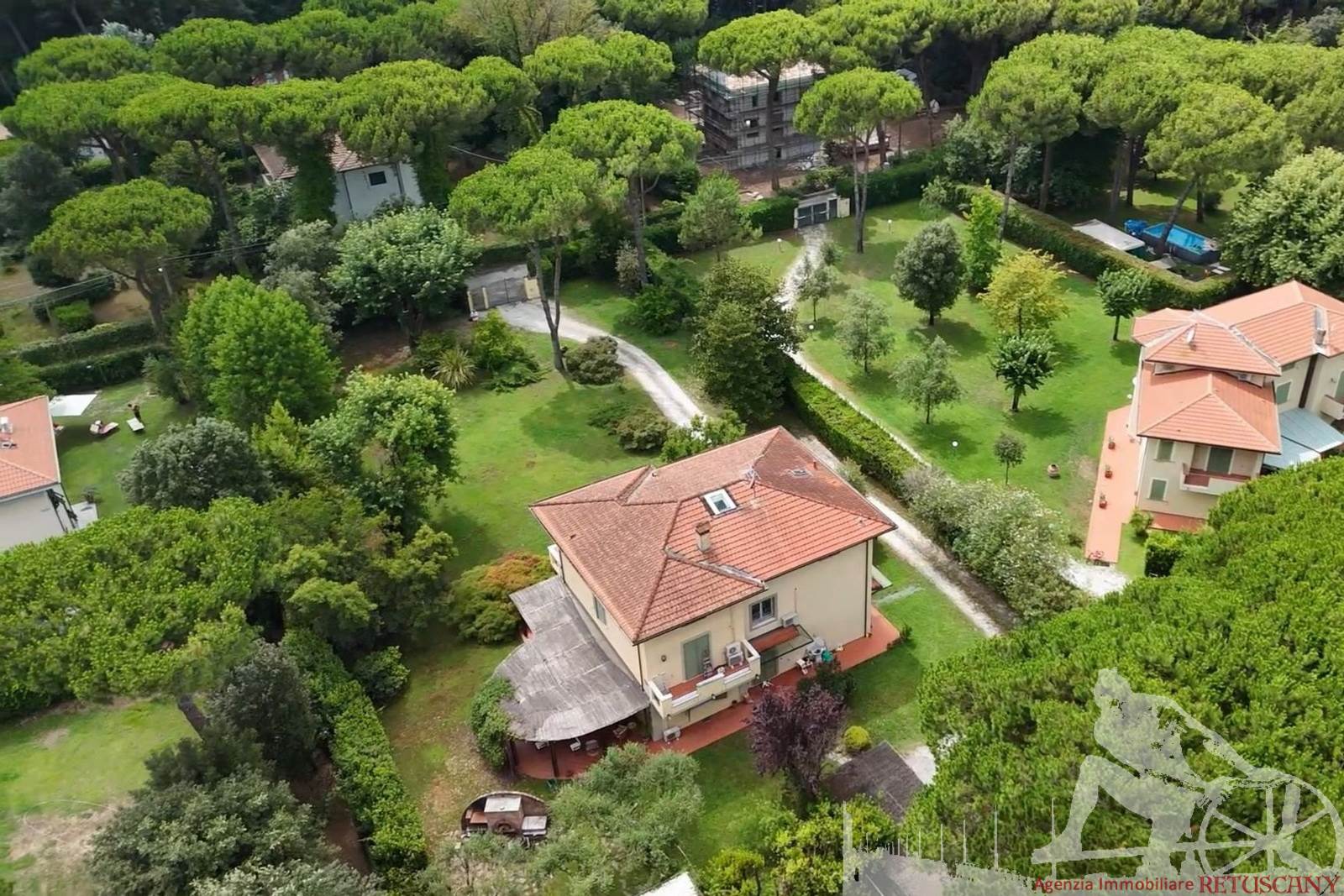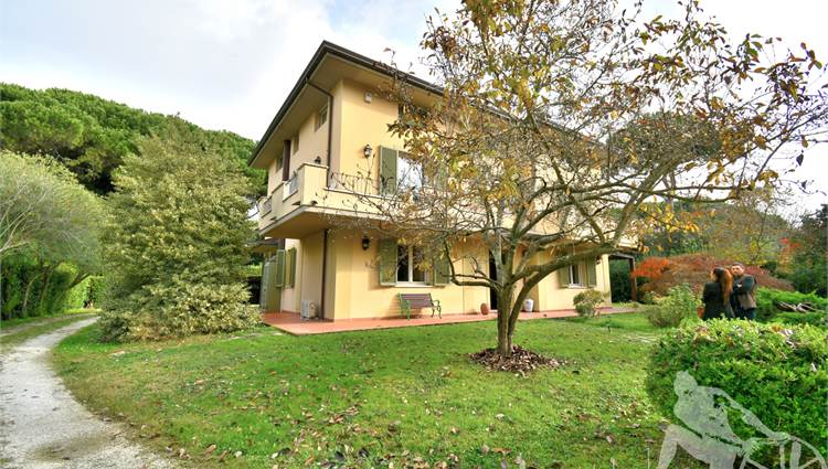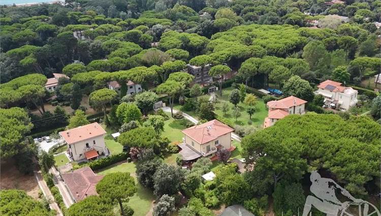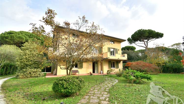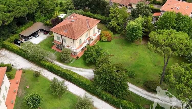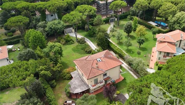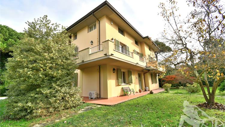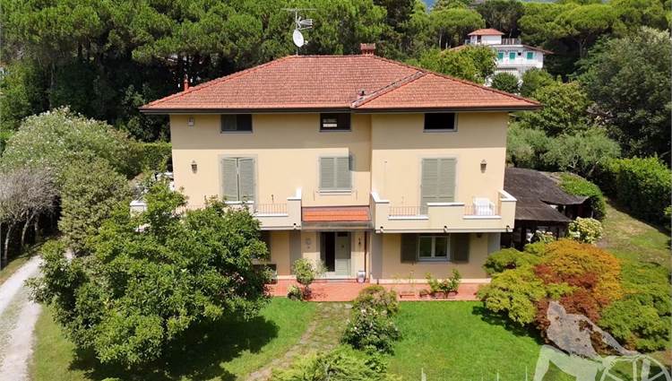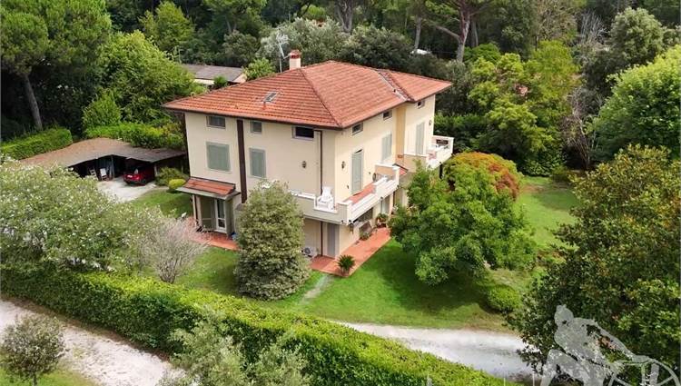 Prestigiosa villa di grandi dimensioni nella pineta di Ronchi, con parco privato e posti auto interni alla proprietà, distribuita su tre livelli fuori terra. Abitazione di circa 450 mq compreso un sottotetto in parte abitabile e in parte comunque fruibile in totalità, giardino di circa 3.000 mq, distanza dal mare circa 400 metri. Al piano terra: ingresso su vano scala, doppio soggiorno con zona pranzo, cucina abitabile, ampio studio, bagno con antibagno, disimpegno, ripostiglio, spazi esterni per il pranzo e il soggiorno all'aperto. Al piano primo: quattro camere matrimoniali di cui una con ampio bagno privato, due ulteriori bagni, disimpegni, tre balconi che servono direttamente tre delle quattro camere. Al piano sottotetto: studio/soggiorno, camera, bagno, disimpegno e ampio locale a destinazione soffitta ma di altezza completamente fruibile.