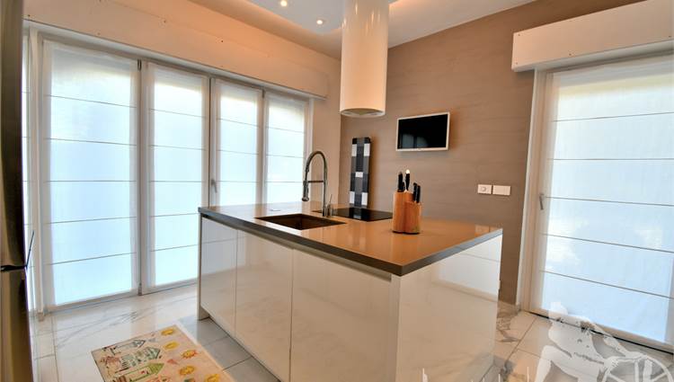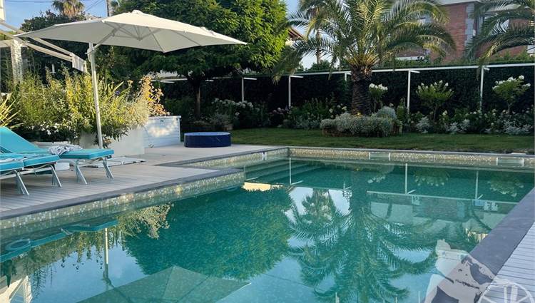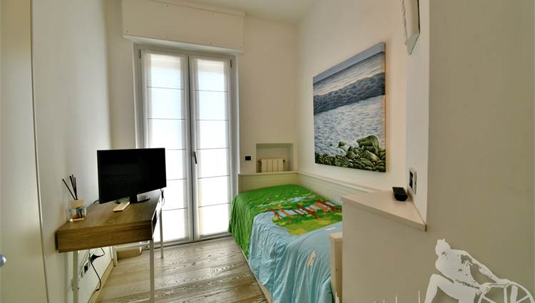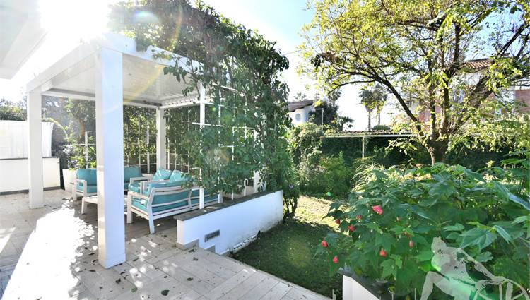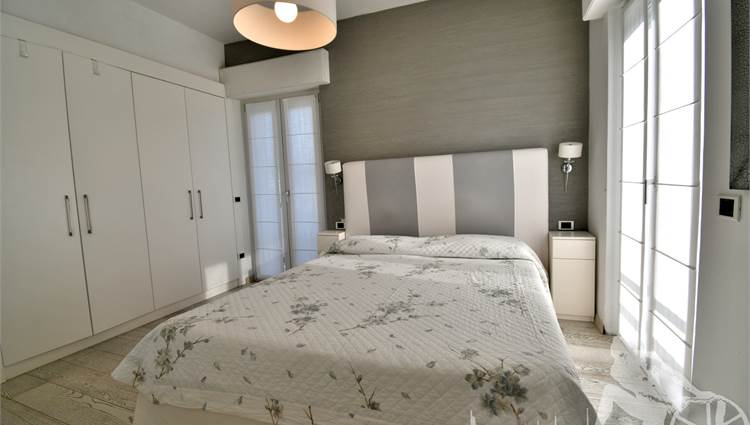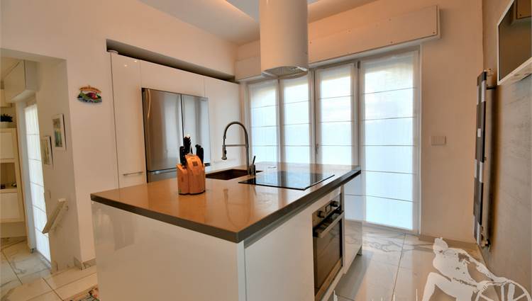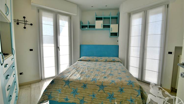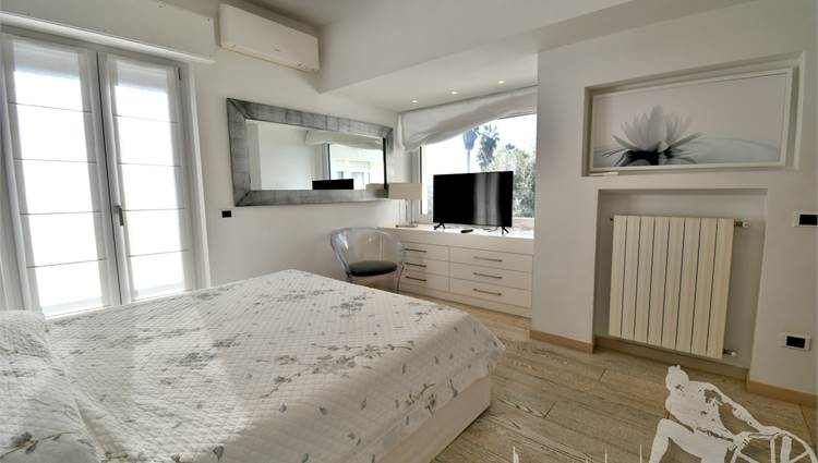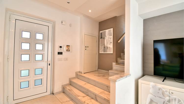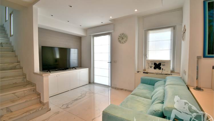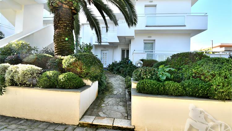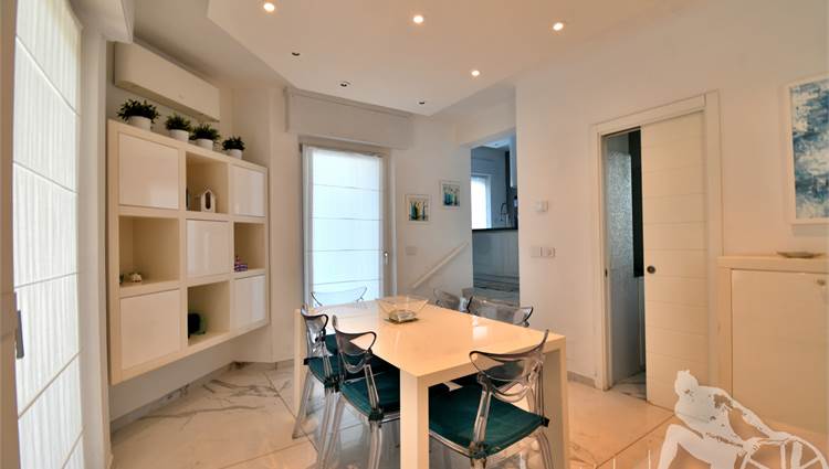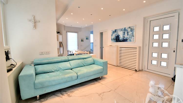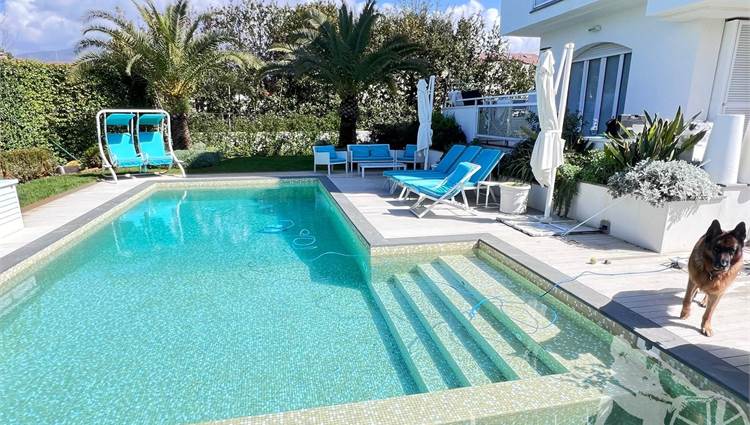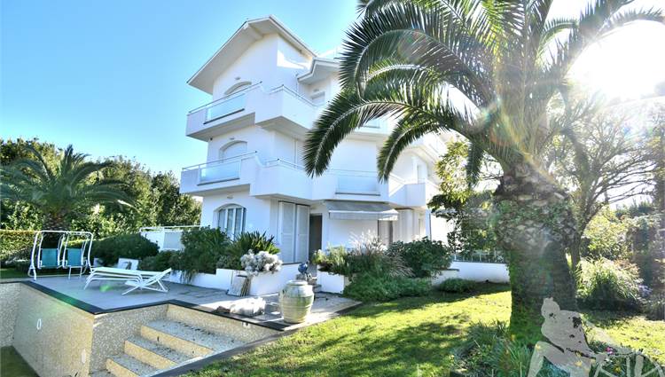 Appartamento in villa trifamiliare con piscina esclusiva, distribuito su due livelli con cantine al piano interrato. Abitazione di circa 110 mq, cantine di circa 100 mq, giardino esclusivo di circa 120 mq, distanza dal mare meno di 100 metri. Superficie commerciale di circa 220 mq. Al piano terra: ingresso, soggiorno pranzo, cucina abitabile, bagno di servizio. Al piano primo: due camere matrimoniali, camera singola, bagno, disimpegno. Al piano interrato: due cantine divise in vari vani.
